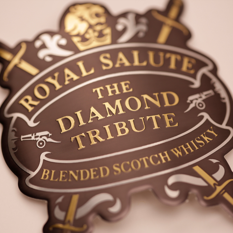 Wir verarbeiten überwiegend Aluminium in den Materialstärken 0,3 mm und 0,5 mm. Für größere Schilder kommt auch 0,8 mm starkes Aluminium zum Einsatz. In der Regel sind metallische Elemente Bestandteil der Logos – entweder als Grundfarbe oder als Text- und Logofarbe. Die Farbgebung erfolgt als hochwertiger Siebdruck, der manchmal durch Digitaldruckelemente ersetzt wird. Ausreichend große Details können zusätzlich erhaben geprägt werden. Mit Hilfe einer speziellen pneumatischen Anlage können wir die Etiketten biegen, um eine Anwendung auf gewölbten Oberflächen wie z.B. Flaschen und Flakons zu ermöglichen.